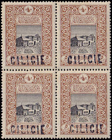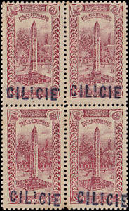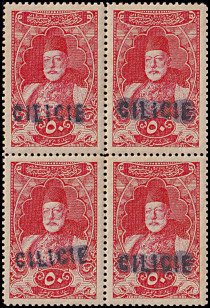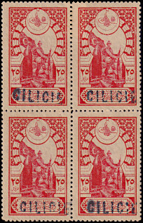 Postanweisung (5000 Piaster) vom 02.08.1919 von Adana frankiert mit 4 Brief-marken a 1 Piaster mit Großem Blockstempel und 4 Briefmarken a 5 Piaster mit Buchdruck-aufdruck