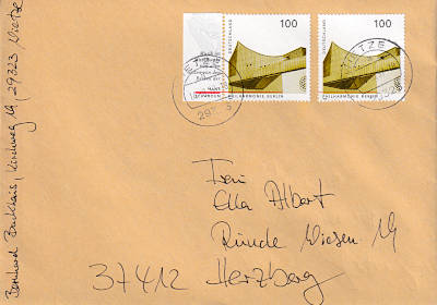 Inlandsbrief (21-50 g) vom 26.08.1997 (11. Periode) frankiert mit 2 Briefmarken a 1 Mark (=2 Mark) |