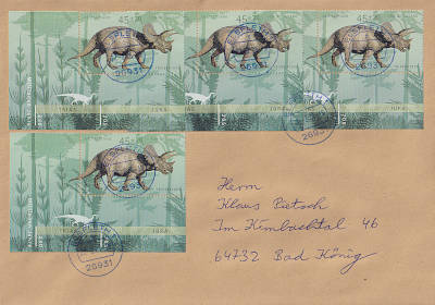 Auslandsbrief mit Luftpost (51-500 g) vom 18.12.2009 (4. Periode) frankiert mit einem Block a 3 € (=3 €) |