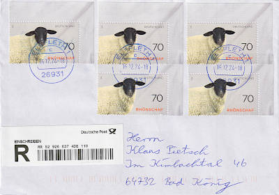 Inlandsbrief mit Übergabe-Einschreiben (1-20 g) vom 16.12.2024 (11. Periode) frankiert mit 5 Briefmarken a 70 Cent (=3,50 €, 0,85 Brief 2,65 Übergabe-Einschreiben) |