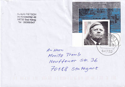 Inlandsbrief mit prioritärer Behandlung (51-500 g) vom 24.07.2019 (10. Periode) frankiert mit einem Block a 3,70 € (=3,70 €, 2,70 Brief 1 Prio) |