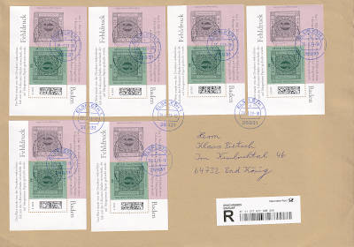 Inlandsbrief mit Übergabe-Einschreiben (51-500 g) vom 25.09.2023 (11. Periode) frankiert mit 5 Blocks a 0,85 € (=4,25 €, 1,60 Brief 2,65 Übergabe-Einschreiben) |