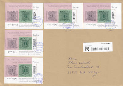 Inlandsbrief mit Einwurf-Einschreiben (501-1 000 g) vom 28.03.2023 (11. Periode) frankiert mit 6 Blocks a 0,85 € (=5,10 €, 2,75 Brief 2,35 Einwurf-Einschreiben) |