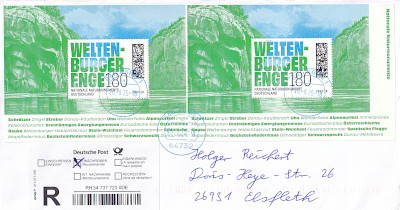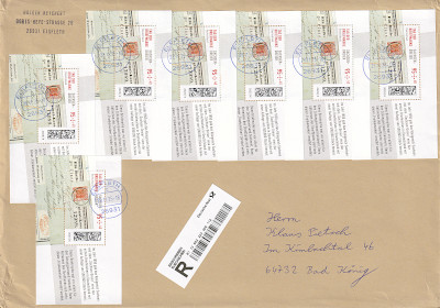 Inlandsbrief mit Übergabe-Einschreiben (1-20 g) vom 28.09.2025 (12. Periode) frankiert mit 2 Blocks a 1,80 € (=3,60 €, 0,95 Brief 2,65 Übergabe-Einschreiben) |