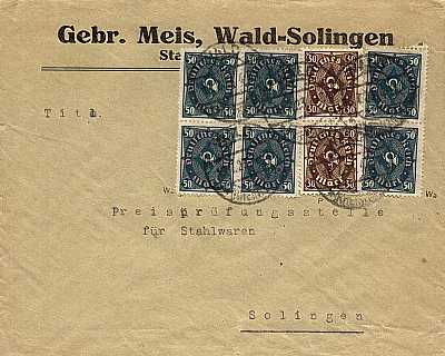 Inlandsbrief (1-20 g) vom 05.07.1923 frankiert mit 10 Marken a 30 Mark (=300 Mark) |