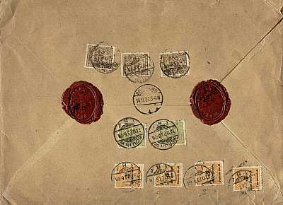 Inlandsbrief mit Wertangabe (2 280 Milliarden Mark) (226 g) vom 13.11.1923 frankiert mit 19 Marken (=71,6 Milliarden Mark, 16 Milliarden Brief 10 Milliarden Einschreiben 45,6 Milliarden Wert)