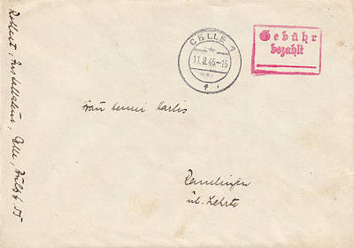 Celle 1: Inlandsbrief (1-20 g) vom 11.08.1945 mit rotem Rechteckstempel (2z) "Gebühr/ bezahlt"