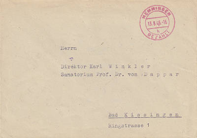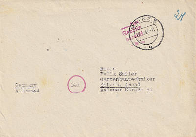 Mainz 3: Inlandsbrief (1-20 g) vom 22.07.1946 mit violettem Vierzeiler (4z) "Rpf./ Gebühr/ bezahlt/ - b -" und handschriftliche Gebührenhöhe "24" |
