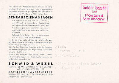 Maulbronn: Inlandsdrucksache (1-20 g) mit magenta Rechteckstempel (4z) "Gebühr bezahlt/ bei/ Postamt/ Maulbronn" |