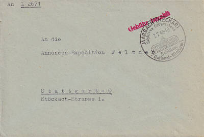 Marbach (Neckar): Inlandsbrief (1-20 g) vom 07.07.1948 mit rotem Einzeiler (z) "Gebühr bezahlt" |