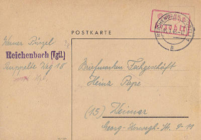 Reichenbach (Vogtland) 1: Inlandspost-karte vom 05.01.1946 mit rotem Rechteck-stempel (2z) "Gebühr/ bezahlt" |