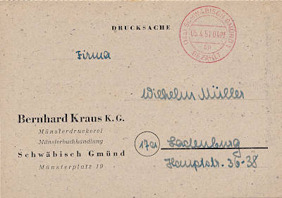 Schwäbisch Gmünd 1: Inlandsdrucksache (1-20 g) vom 05.04.1951 mit rotem Zwei-kreisstegstempel (bo2zbu) "(14a) SCHWÄB-ISCH GMÜND 1/ (Datum) 04Pf/ ap/ BEZAHLT" |