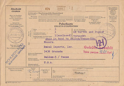 Schwäbisch Gmünd 1: Auslandspaketkarte (5 500 g) vom 25.11.1958 mit Zweizeiler (2z) "Gebühr bezahlt/ Taxe perçue DM" und handschriftliche Gebührenhöhe "12,20" |
