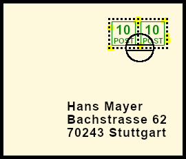 falsche Frankatur: betrügerische Nachahmung einer Frankatur mit echten gestempelten Briefmarken aber falscher Zusammenstellung |