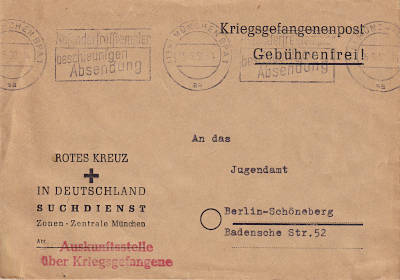 Hinweisvermerk Kriegsgefangenenpost: Vermerk der auf eine gebührenfreie Post-sendung zwischen einem Kriegsgefangenen und dessen Angehörigen hinweist |