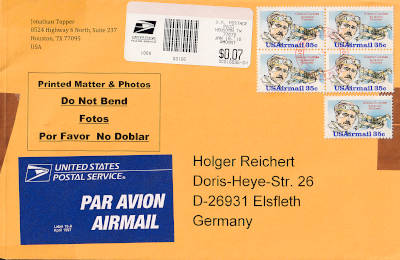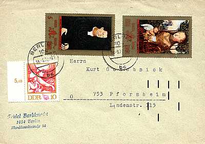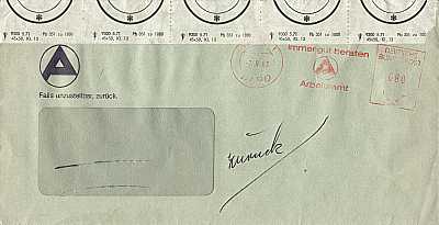 Absenderfreimachungsvermerk: Vermerk auf einer von einem Absender frankiert ein-gelieferten Postsendungen bei der die Über-frankatur nicht von der Post zu verantworten ist (5 DM anstatt 4 DM) |