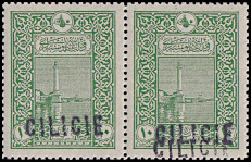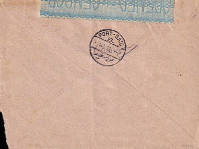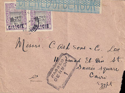 Auslandsbrief vom 25.04.1919 von Mersina nach Kairo (Ägypten) mit grünem Zensurstreifen und vorderseitigem Zensurstempel frankiert mit 2 Briefmarken a 1 Piaster mit Großem Blockstempel