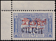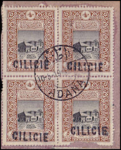Postanweisung (5000 Piaster) vom 02.08.1919 von Adana frankiert mit 4 Brief-marken a 1 Piaster mit Großem Blockstempel und 4 Briefmarken a 5 Piaster mit Buchdruck-aufdruck
