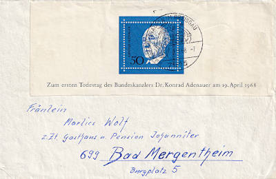 Inlandsbrief mit Einschreiben (1-20 g) vom 29.04.1968 (4. Periode) frankiert mit 4 Briefmarken (=1,10 Mark, 0,30 Brief 0,80 Einschreiben) |