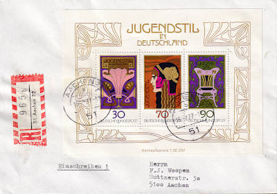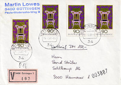 Inlandsbrief mit Wertangabe (150 DM) (16 g) vom 19.07.1981 (8. Periode) frankiert mit 4 Briefmarken a 90 Pfennig (=3,60 Mark, 0,60 Brief 3 Wert) |