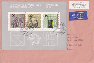 Auslandsbrief mit Luftpost (1-5 g) vom 17.05.1988 (9. Periode) frankiert mit 2 Brief-marken a 80 Pfennig (=1,60 Mark, 1,20 Brief 0,40 Luftpost) |