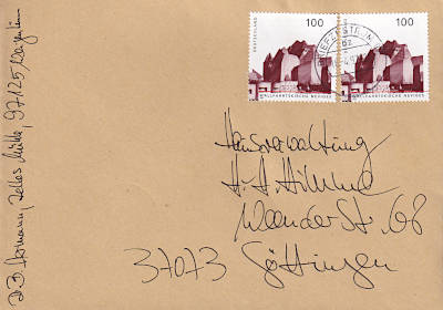 Inlandsbrief (21-50 g) vom 26.08.1997 (11. Periode) frankiert mit 2 Briefmarken a 1 Mark (=2 Mark) |
