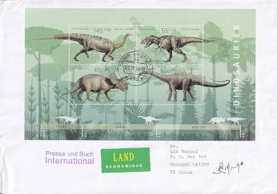 Auslandsbüchersendung (1-500 g) vom 09.12.2014 (6. Periode) frankiert mit einem Block a 3 € (=3 €) |