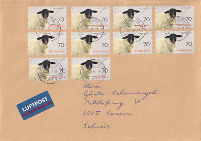 Auslandsbrief (501-1 000 g) vom 24.11.2016 (9. Periode) frankiert mit 10 Briefmarken a 70 Cent (=7 €) |