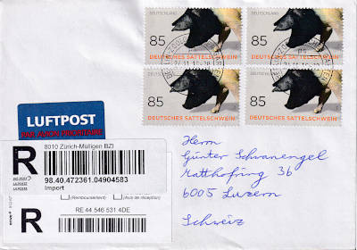 Auslandsbrief mit Einschreiben (1-20 g) vom 24.11.2016 (9. Periode) frankiert mit 4 Briefmarken a 85 Cent (=3,40 €, 0,90 Brief 2,50 Einschreiben) |