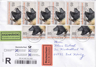 Inlandsbrief mit Übergabe-Einschreiben, Rückschein und eigenhändiger Zustellung (21-50 g) vom 25.11.2016 (9. Periode) frankiert mit 9 Briefmarken a 85 Cent (=7,65 €, 0,85 Brief 2,50 Übergabe-Ein-schreiben 2,15 Rückschein 2,15 Eigenhändig) |