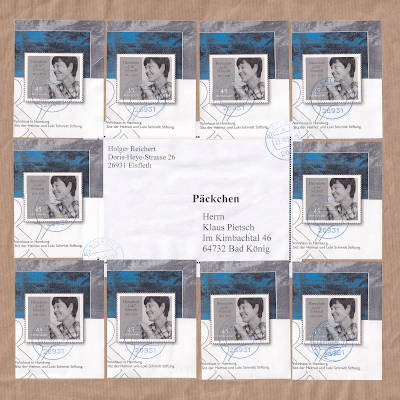 Inlandspäckchen (1-2 000 g) vom 22.06.2021 (10. Periode) frankiert mit 10 Briefmarken a 45 Cent (=4,50 €) |