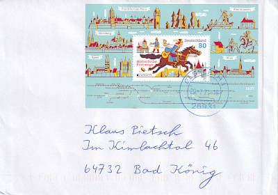 Inlandsbrief (51-500 g) vom 29.09.2022 (11. Periode) frankiert mit 2 Blocks a 80 Cent (=1,60 €) |