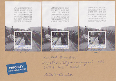 Auslandsbrief (51-500 g) vom 13.08.2025 (12. Periode) frankiert mit 3 Blocks a 1,10 € (=3,30 €) |