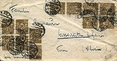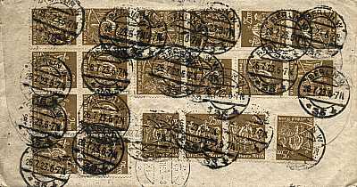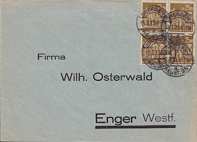 Inlandsbrief (1-20 g) vom 13.03.1923 (13. Periode) frankiert mit 4 Marken a 25 Mark (=100 Mark) |