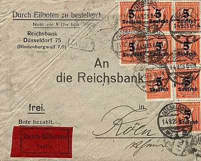 Inlandsbrief mit Eilzustellung (1-20 g) vom 14.09.1923 (17. Periode) frankiert mit 45 Marken a 5 000 Mark auf 40 Pfennig (=225 000 Mark, 75 000 Brief 150 000 Eilzustellung)