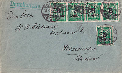 Auslandsdrucksache (1-50 g) vom 19.09.1923 (17. Periode) frankiert mit 5 Marken a 8 000 Mark auf 30 Pfennig (=40 000 Mark)