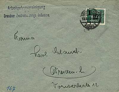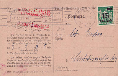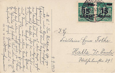 Ortspostkarte vom 05.09.1923 (17. Periode) frankiert mit einer Marke a 15 000 Mark auf 40 Mark (=15 000 Mark) |
