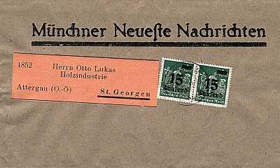 Auslandsdrucksache (26-50 g) vom 10.09.1923 (17. Periode) frankiert mit 2 Marken a 15 000 Mark auf 40 Mark (=30 000 Mark); nach Österreich galt der Inlandstarif |