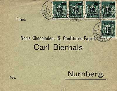 Inlandsbrief (1-20 g) vom 05.09.1923 (17. Periode) frankiert mit 5 Marken a 15 000 Mark auf 40 Mark (=75 000 Mark) |