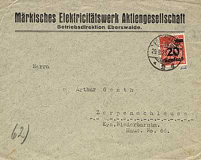 Inlandsbrief (1-20 g) vom 29.08.1923 (16. Periode) frankiert mit einer Marke a 20 000 Mark auf 12 Mark (=20 000 Mark) |