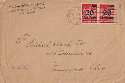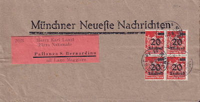 Auslandsdrucksache (1-50 g) vom 19.09.1923 (17. Periode) frankiert mit 2 Marken a 20 000 Mark auf 12 Mark (=40 000 Mark) |