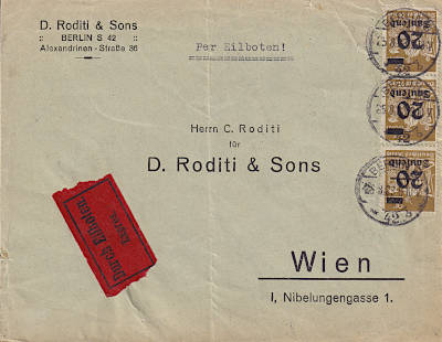 Auslandsbrief mit Eilzustellung (1-20 g) vom 25.08.1923 (16. Periode) frankiert mit 3 Marken a 20 000 Mark auf 25 Mark (=60 000 Mark, 20 000 Brief 40 000 Eilzustellung); nach Österreich galt der Inlandstarif |