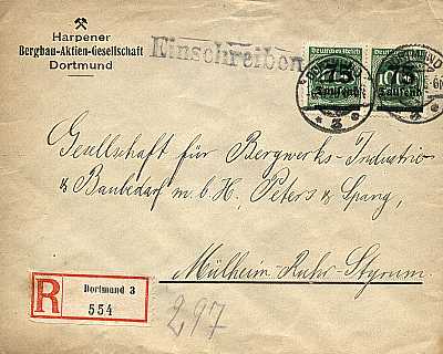 Inlandsbrief mit Einschreiben (1-20 g) vom 06.09.1923 (17. Periode) frankiert mit 2 Marken a 75 000 Mark auf 1 000 Mark (=150 000 Mark, 75 000 Brief 75 000 Einschreiben) |