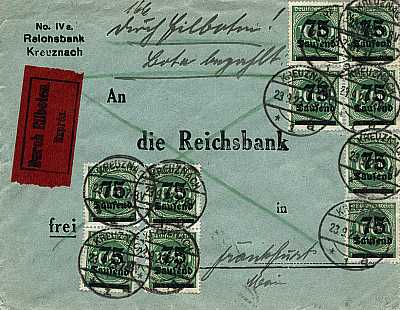 Inlandsbrief mit Eilzustellung (1-20 g) vom 23.09.1923 (18. Periode) frankiert mit 10 Marken a 75 000 Mark auf 1 000 Mark (=750 000 Mark, 250 000 Brief 500 000 Eilzustellung) |