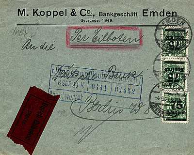 Inlandsbrief mit Eilzustellung (1-20 g) vom 04.09.1923 (17. Periode) frankiert mit 3 Marken a 75 000 Mark auf 1 000 Mark (=225 000 Mark, 75 000 Brief 150 000 Eilzustellung) |