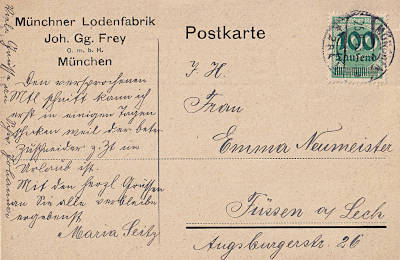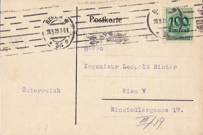 Auslandspostkarte vom 28.09.1923 (18. Periode) frankiert mit einer Marke a 100 000 Mark auf 400 Mark (=100 000 Mark); nach Österreich galt der Inlandstarif |