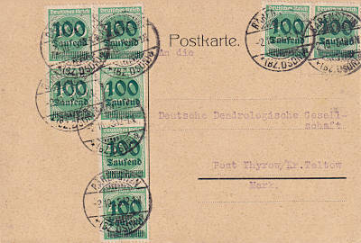 Inlandspostkarte vom 25.09.1923 (18. Periode) frankiert mit einer Marke a 100 000 Mark auf 400 Mark (=100 000 Mark) |