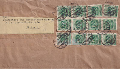 Auslandsdrucksache (51-100 g) vom 06.10.1923 (19. Periode) frankiert mit 12 Marken a 100 000 Mark auf 400 Mark (=1,2 Millionen Mark); nach Österreich galt der Inlandstarif |