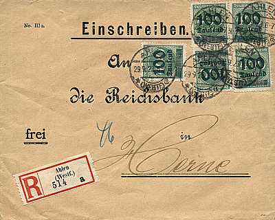 Inlandsbrief mit Einschreiben (1-20 g) vom 29.09.1923 (18. Periode) frankiert mit 5 Marken a 100 000 Mark auf 400 Mark (=500 000 Mark, 250 000 Brief 250 000 Einschreiben) |
