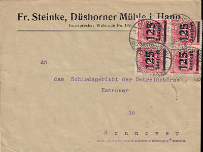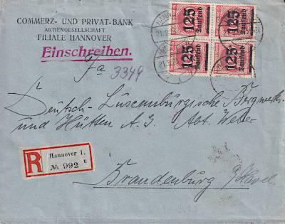 Inlandsbrief mit Einschreiben (1-20 g) vom 21.09.1923 (18. Periode) frankiert mit 4 Marken a 125 000 Mark auf 1 000 Mark (=500 000 Mark, 250 000 Brief 250 000 Einschreiben) |